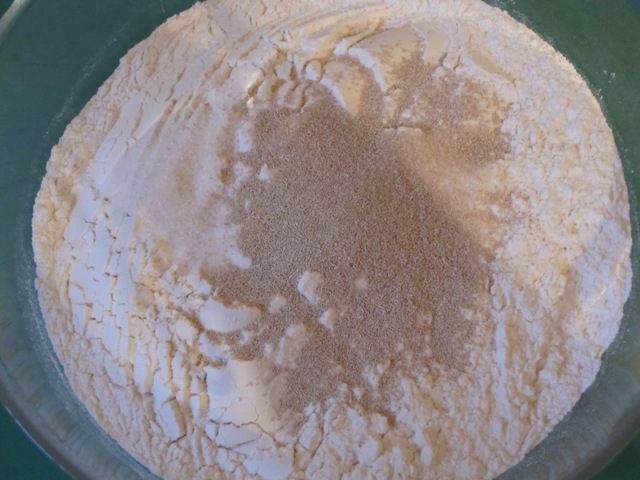 Сначала надо приготовить тесто. Просеять муку, добавить сахар, соль по вкусу, сухие дрожжи.