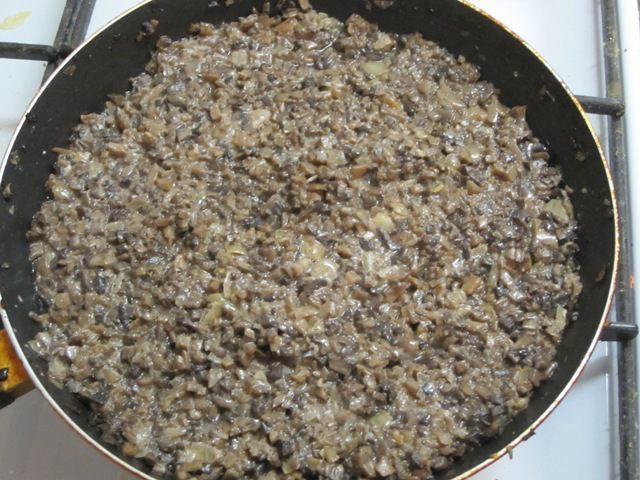 Выложить на сухую сковороду. Грибы должны отдать воду. Когда вода выпарится, влить 2 столовые ложки растительного масла, добавить мелко нарезанный лук. Перемешать и обжарить. Посолить, поперчить. Грибная начинка готова.