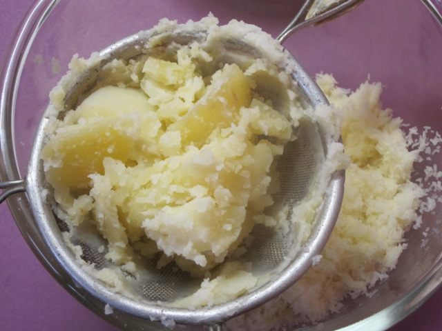 Картофель размять. Я протираю картофель через сито.