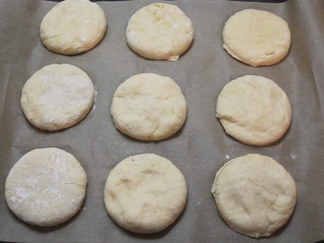 Раскатать в круглые лепёшки. Оставить на 10 минут на расстойку.