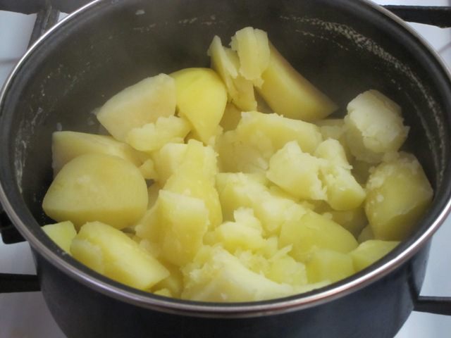 Воду, в которой варился картофель, слить. Картофель обсушить на огне.