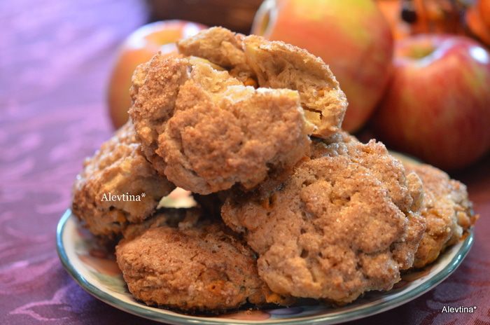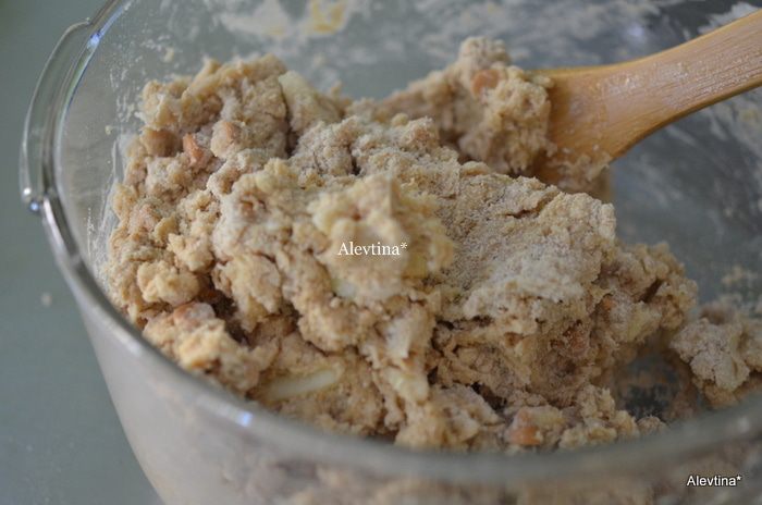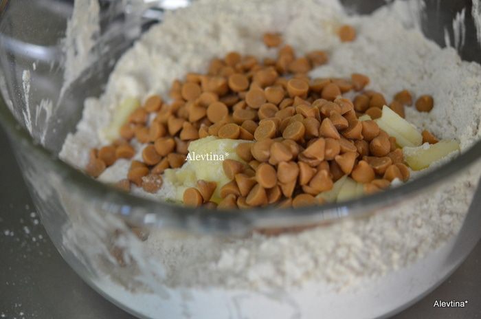 Затем добавить холодное масло кусочками в мучную смесь и порубить все вместе в крошку. Выложим 1 яблоко среднего размера, мелко порезанное и 3/4 стакана чипсы ирисовые (Butterscotch).