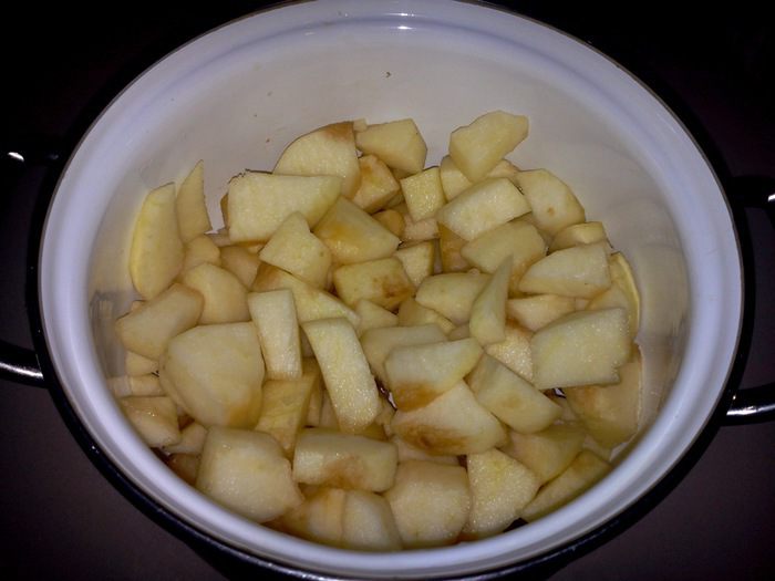 Яблоки почистить и нарезать на крупные кусочки. Половину яблок оставить, к другой половине добавить масло, корицу и сахар, тушить на медленном огне до мягкости.
