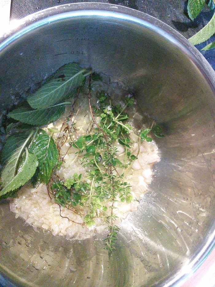 Лук и чеснок мелко нарезать. В кастрюльке разогреть оба вида масла, добавить травки целыми веточками, добавить лук/чеснок и спассеровать до полупрозрачности.