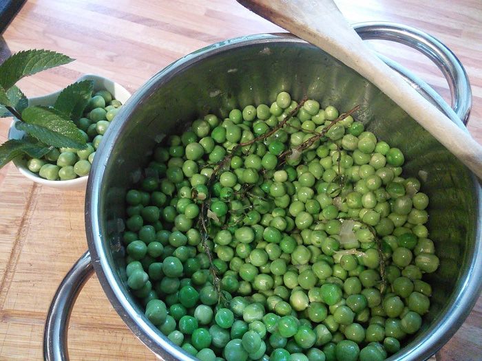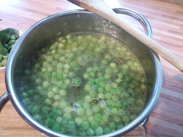 Вынуть травки, они отдали свои ароматы ( тимьян я оставила, мне показалось он ещё может быть полезен), забросить горошек, перемешать. Несколько столовых ложек горошка отложить в сторону.