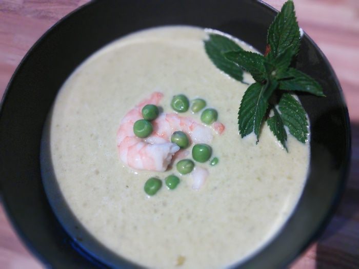 Супчик сервировать креветками и отдельно сваренным горошком, мятой. Приятного аппетита!