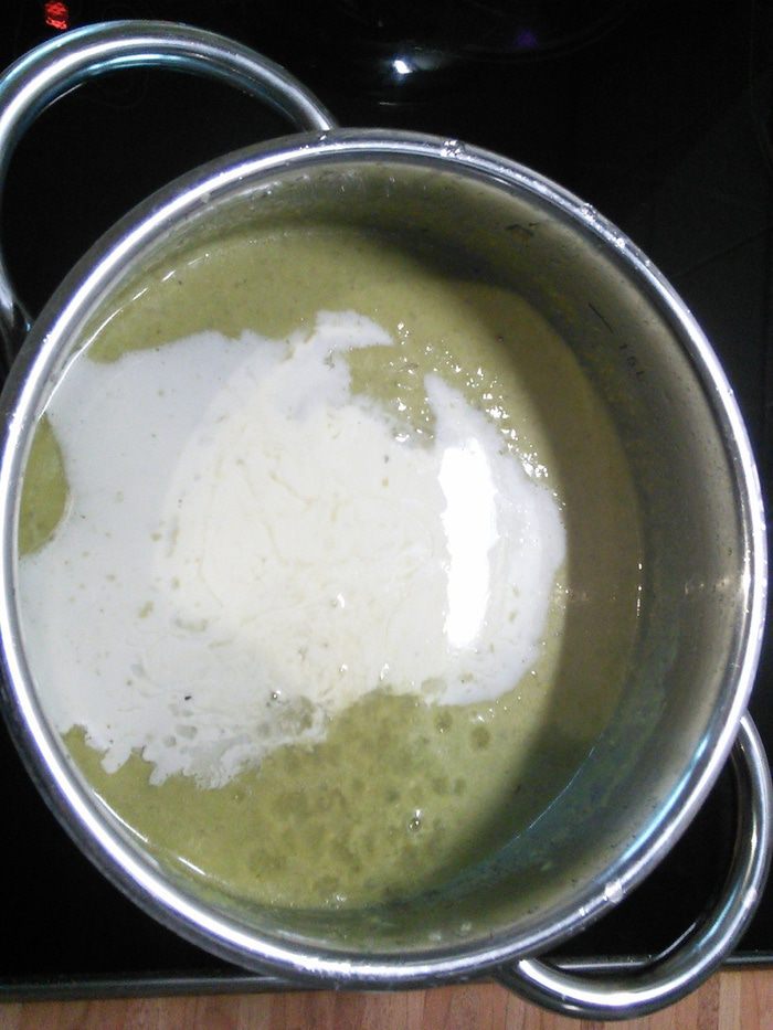 Готовый горошек взбить погружным блендером до кремовой консистенции. Посолить, поперчить, влить сливки, прогреть. По желанию добавить свежую мяту.