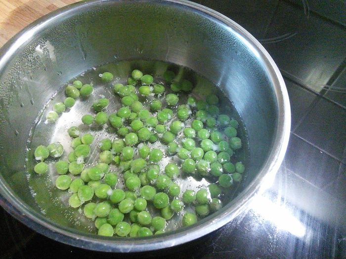 Отставленный в сторону горошек отварить отдельно в подсоленной воде в течении 10 мин. Обдать ледяной водой, чтобы сохранить яркий зелёный цвет.