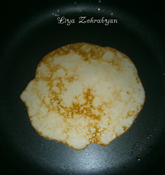 Поджарить блинчики на хорошо разогретой и слегка смазанной маслом сковороде с двух сторон до золотистого цвета.
