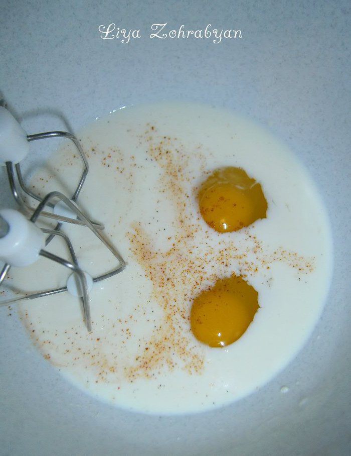 Молоко взбить с яйцами, сахаром, солью и паприкой.
