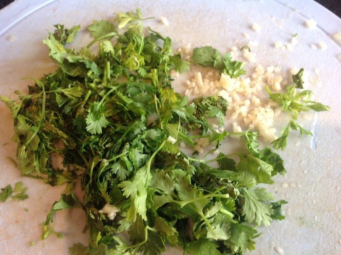 Чеснок мелко нарежьте, кинзу - крупно.