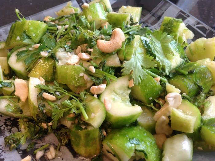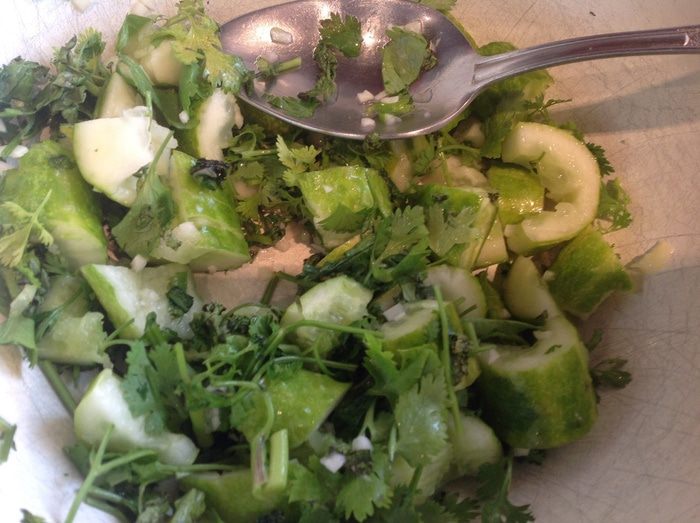 Смешайте огурцы, кинзу и чеснок в салатнике.