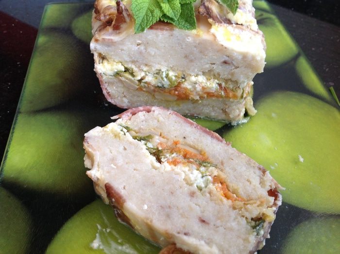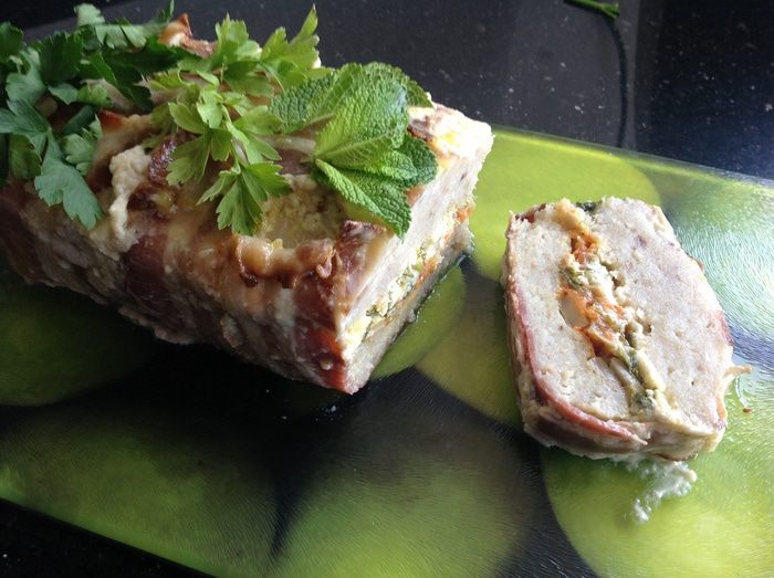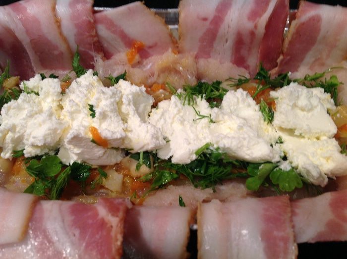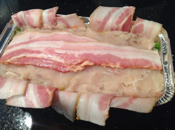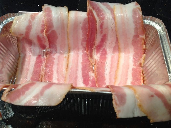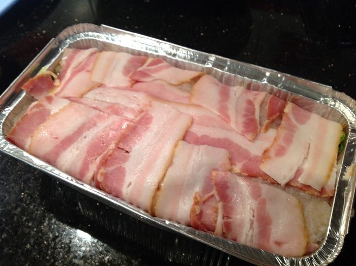 Накрыть концами бекона, избегая зазоров. Накрыть фольгой и выпекать в предварительно нагретой до 180 градусов духовке около 1 часа.