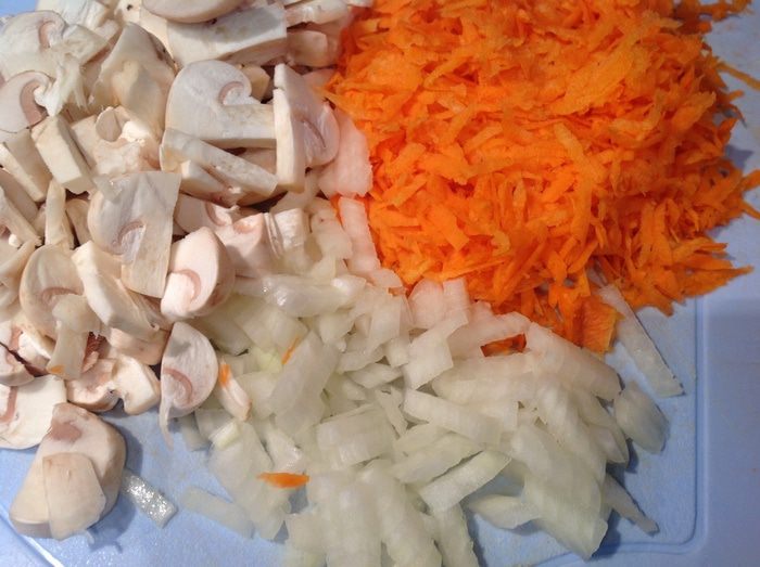 Лук и грибы мелко порезать, морковь натереть на крупной терке.
