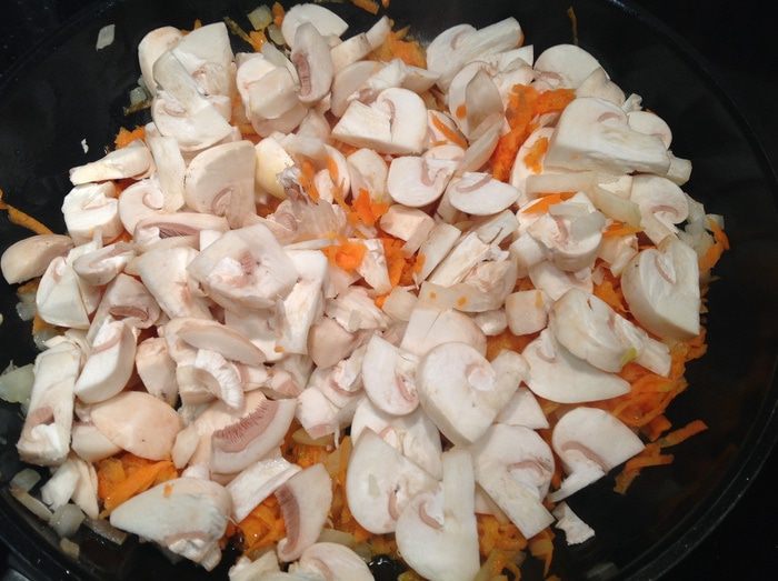 Через 2 минуты, добавить морковь и грибы, и жарить еще 8 минут. Посолить.
