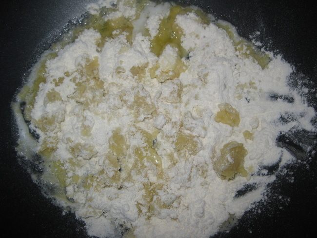 Сливочное масло или маргарин растопить, спассеровать на нем муку, слегка охладить.