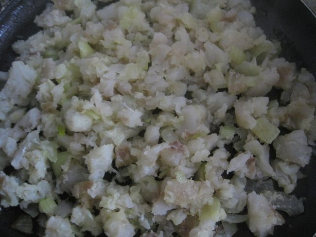 Рыбное филе и лук нарезать кубиками, обжарить на растительном масле.