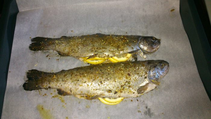 Смазать форель внутри и снаружи оставшимся оливковым маслом, приправить солью и перцем.