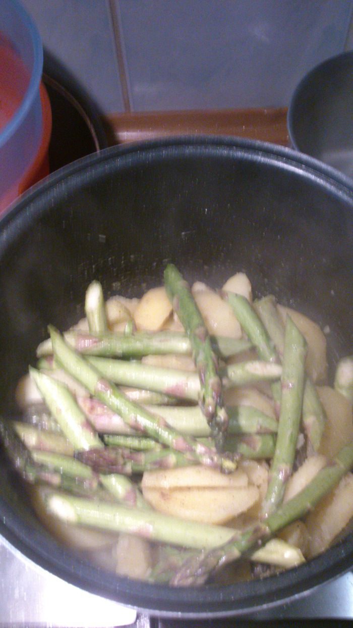 Смешать вместе картофель, спаржу, соль, перец и одну ложку оливкового масла.