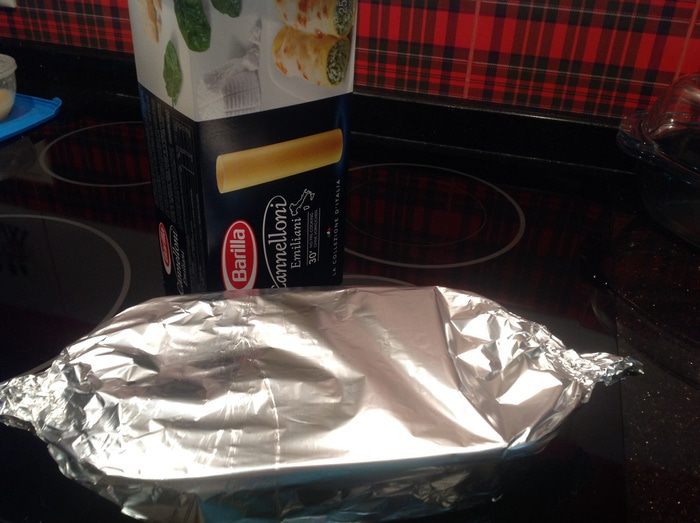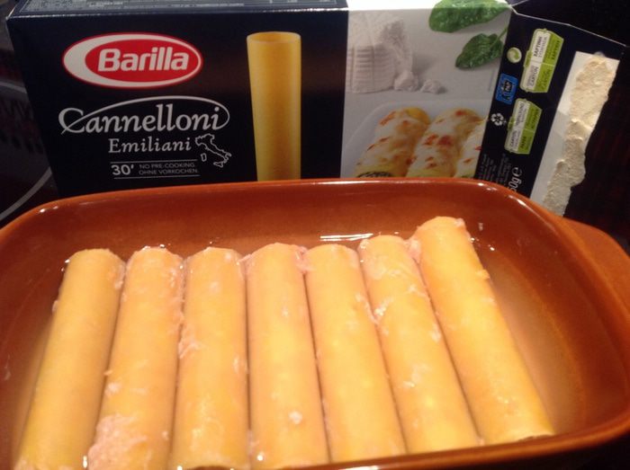 Заправить каннеллони фаршем и положить в форму для запекания. Налить кипяток, так чтобы полностью покрывало водой, но не больше.