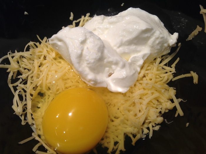 Сыр (можно использовать любой твердый сыр, у меня Российский) натереть, добавить яйцо и сметану, хорошо смешать.