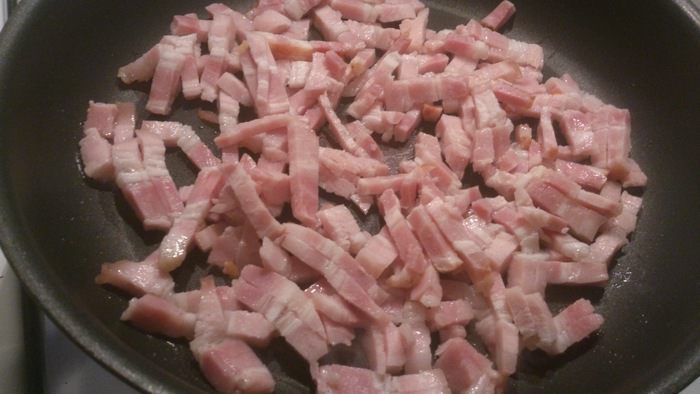 Бекон нарезать соломкой и обжарить на сухой сковороде, добавить к тыкве.