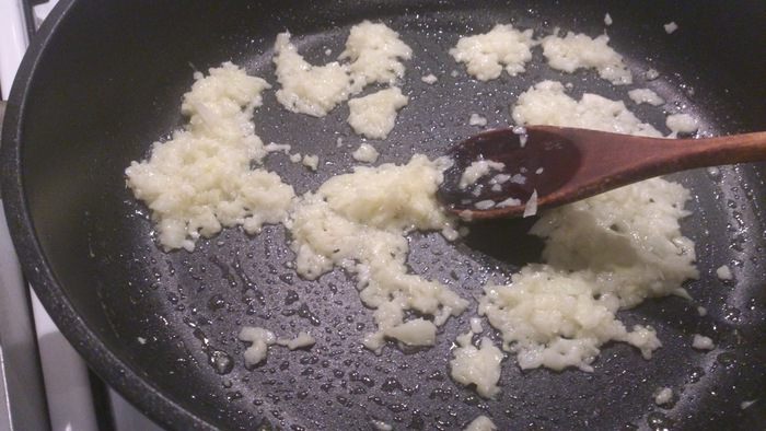 Лук и чеснок очистить, измельчить. Обжарить 5 минут на смеси сливочного и оливкового масла.