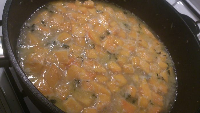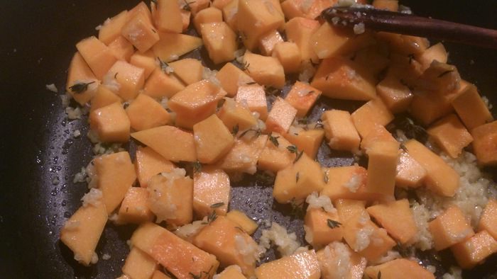 Добавить тыкву и тимьян, обжаривать 5 минут.