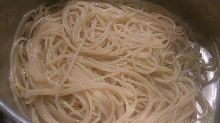 Спагетти отварить по инструкции на упаковке. Немного воды оставить.