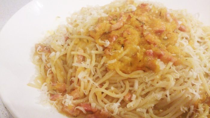 После битвы пицц я сделала для себя одно открытие! Если из тыквы сделать соус и добавить к нему бекон или хамон, то мой младший вредина ест этот соус за обе щеки. И при этом еще и добавку просит! Вот и возникла идея такого блюда))