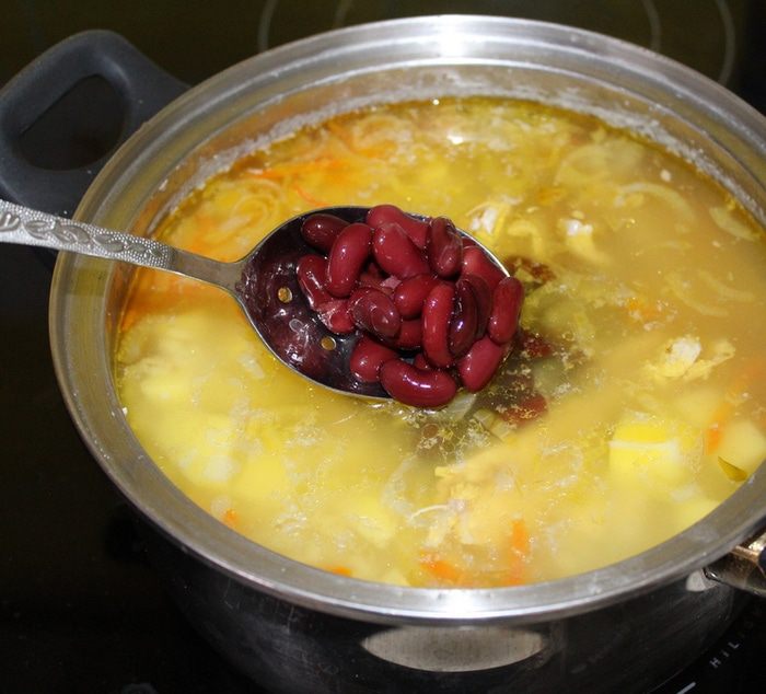 Добавьте в суп консервированную фасоль, посолите, поперчите и варите еще 5 минут.