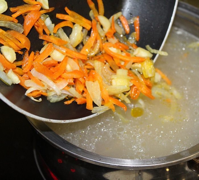Обжарьте порезанную морковь, лук, сельдерей и чеснок и тоже спустите в бульон, поварите еще 10 минут