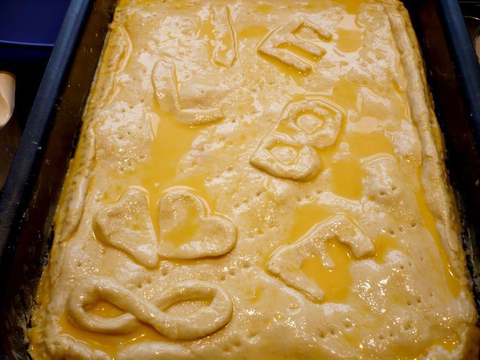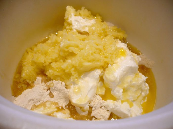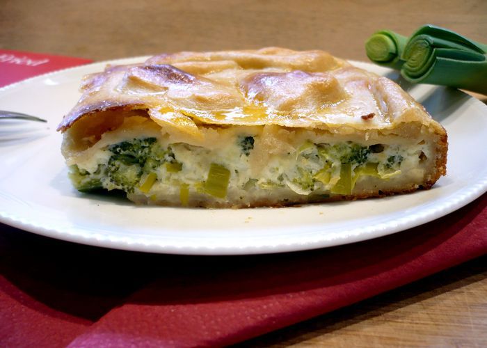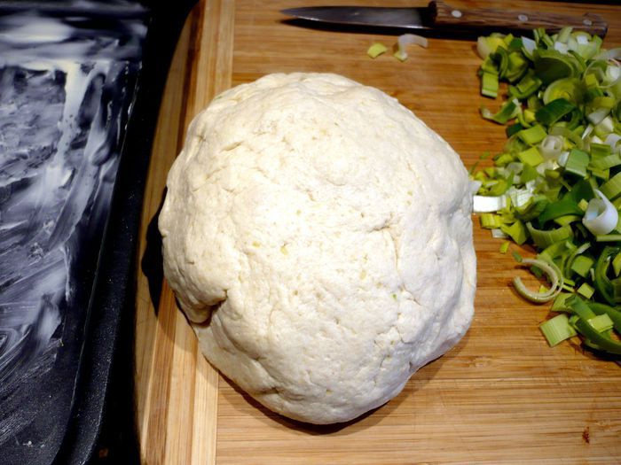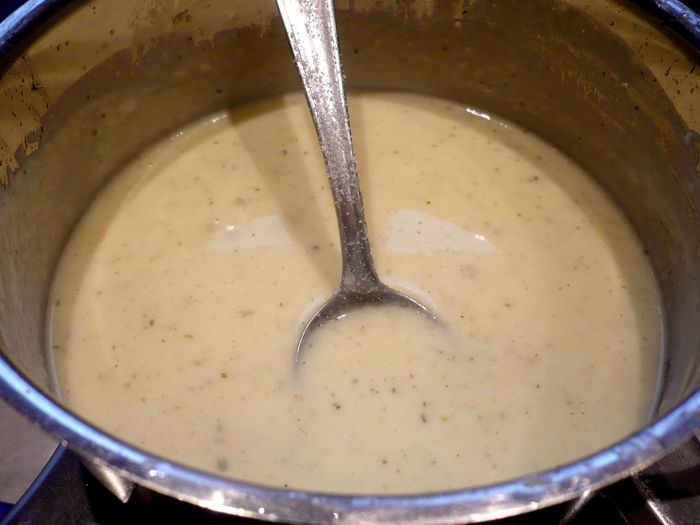 Теперь приготовим заливку для пирога. Разогреем в сотейнике сливочное масло, добавим муку, перемешаем до однородности, зальем горячий бульон и сметану, перемешаем, дадим закипеть, снимем с огня, посолим, поперчим, добавим два натертых зубчика чеснока.