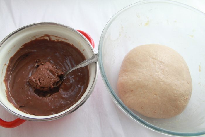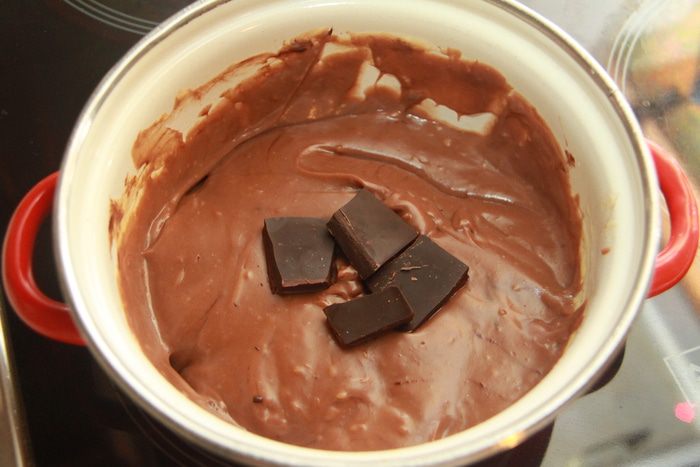 И шоколад. В теплом креме шоколад отлично растворится. Тщательно размешать шоколадный крем, можно миксером.
