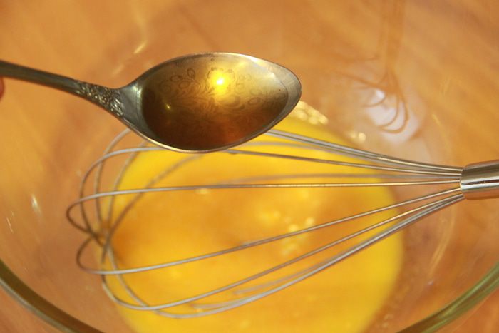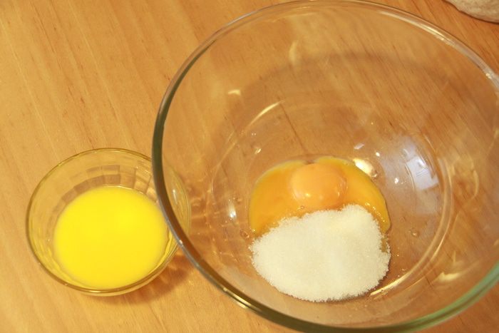 В отдельной миске смешать желтки и сахар, добавить соль и растопленное масло.