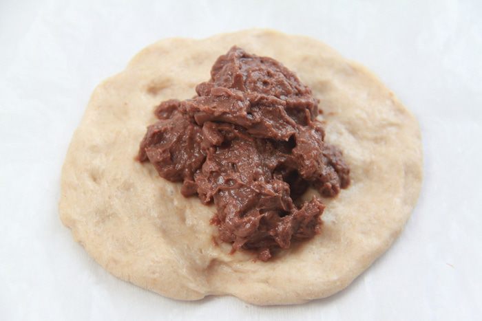 Из кусочка теста сформировать руками лепешку размером с ладонь, в центр положить 1-1,5 ст.л. крема.