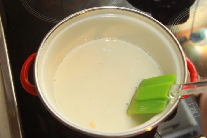 Постепенно влить по чуть-чуть горячее молоко, тщательно размешать, варить на слабом огне до загустения.