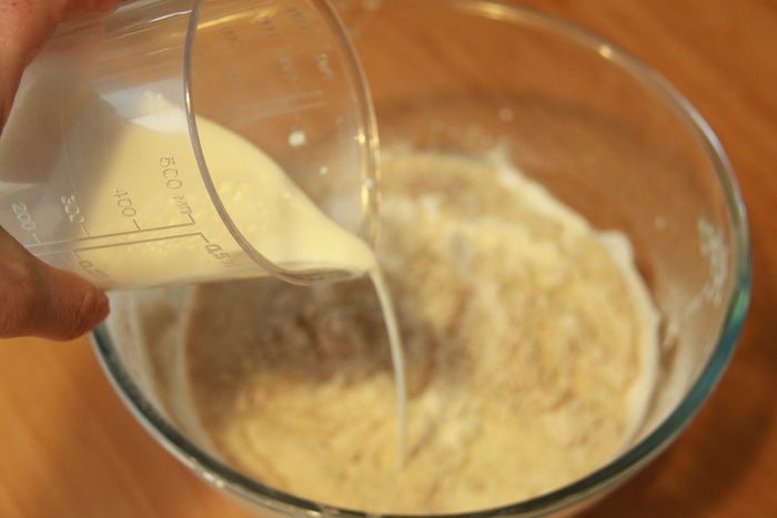 Добавить дрожжи и теплое молоко.