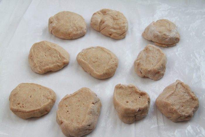 Тесто разделить на равные кусочки. Я делала половину нормы рецепта и получилось 10 кусочков.