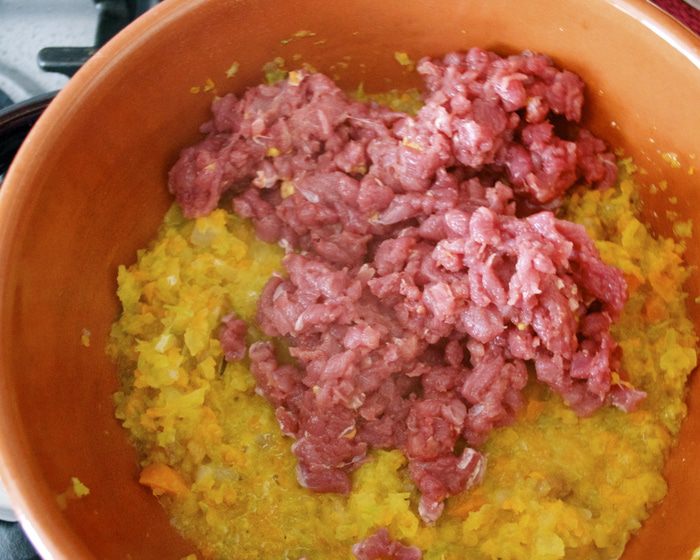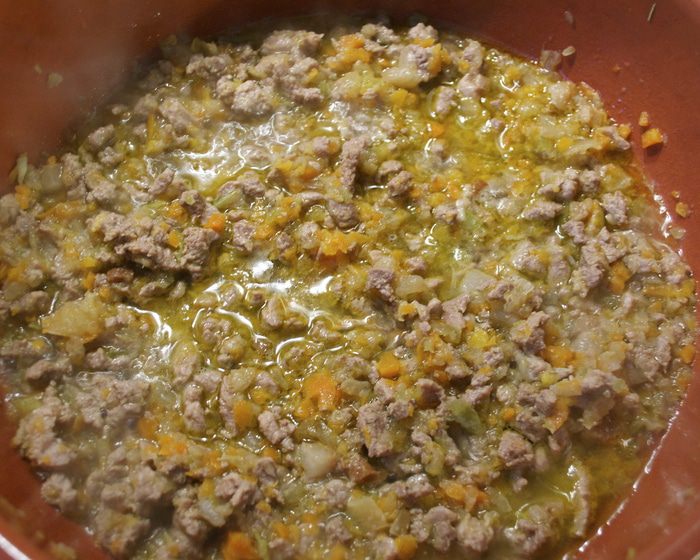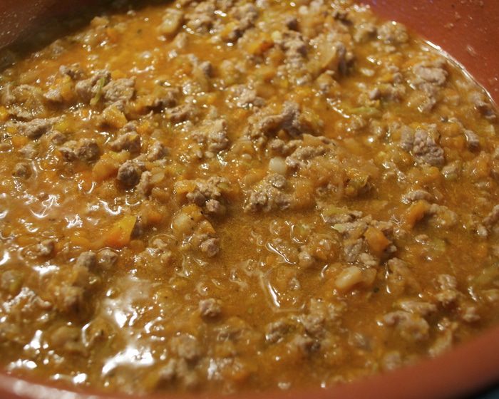 ... и добавить в сковороду. Посолить и поперчить соус, накрыть крышкой сковороду и тушить на очень маленьком огне около 2-х часов! (не удивляйтесь, подобные мясные соусы, для лазаньи, в частности, всегда подвергаются длительной термической обработке).