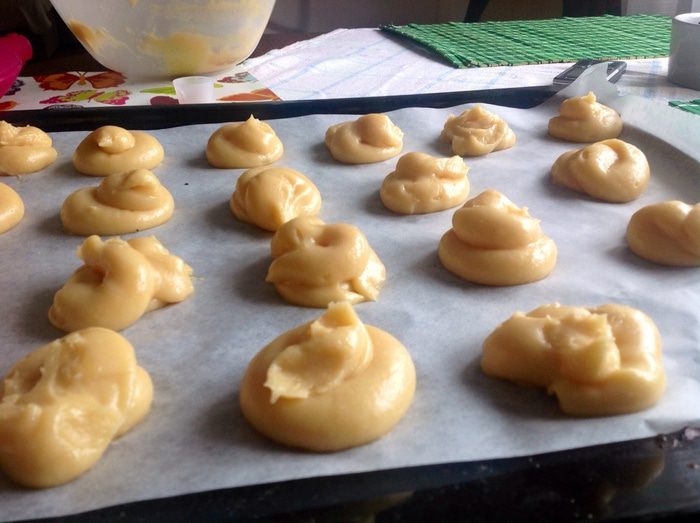 Воду, масло, соль, сахар доводим до закипания....добавляем муку ...мешаем до отставания теста от стенок кастрюльки...немного остужаем и вводим яйца...взбиваем до однородности.