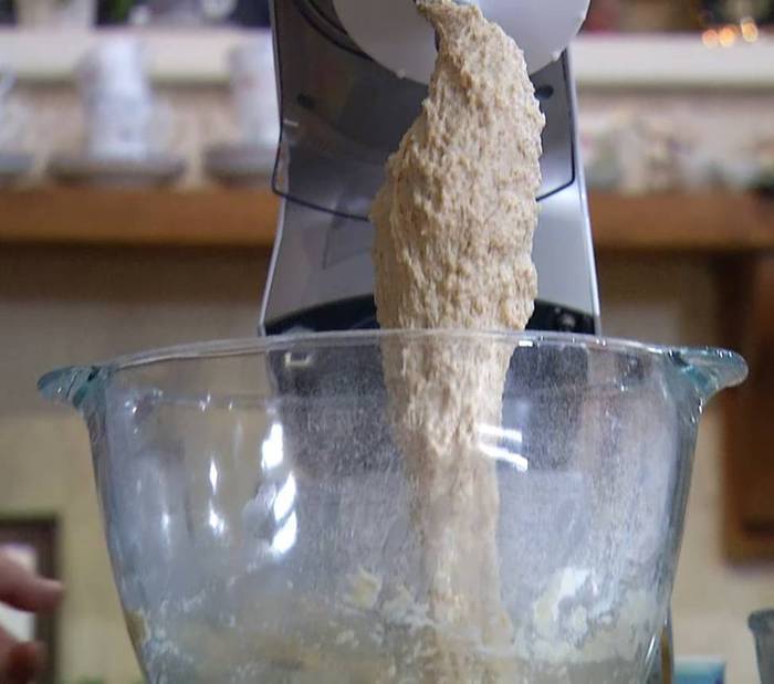 Цельнозерновую муку и 300 г пшеничной муки просеять, поместить в чашу комбайна, всыпать дрожжи, соль и перемешать все насадкой-крюком, затем, не выключая комбайна, влить теплое молоко с водой и вымешать тесто.