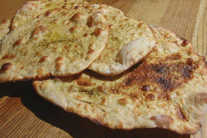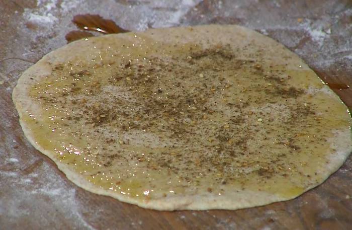 Подошедшее тесто раскатать в очень тонкие лепешки, при помощи кисточки смазать оливковым маслом и посыпать заатаром.