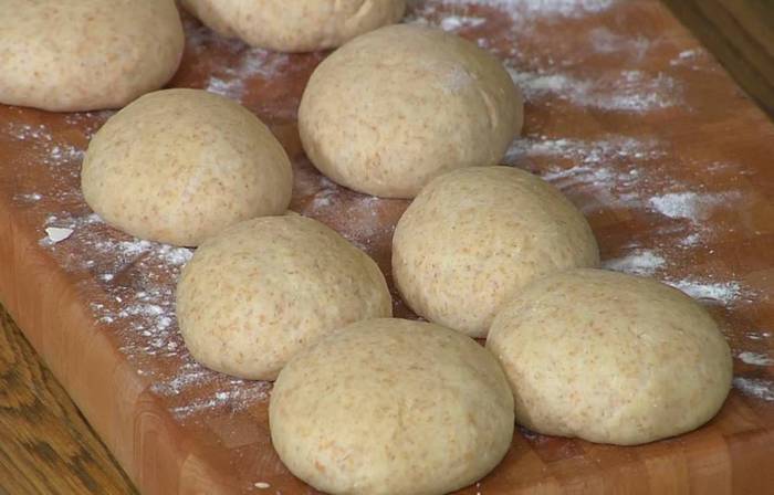 Отдохнувшее тесто выложить на посыпанную мукой рабочую поверхность, разделить на 8 частей, сформировать небольшие шарики, накрыть их сухим полотенцем и оставить для расстойки в теплом месте.