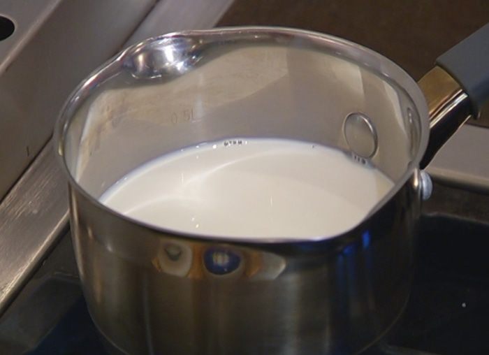 Молоко влить в кастрюлю, добавить 100 мл воды, сахар и нагреть на маленьком огне примерно до 40°С.