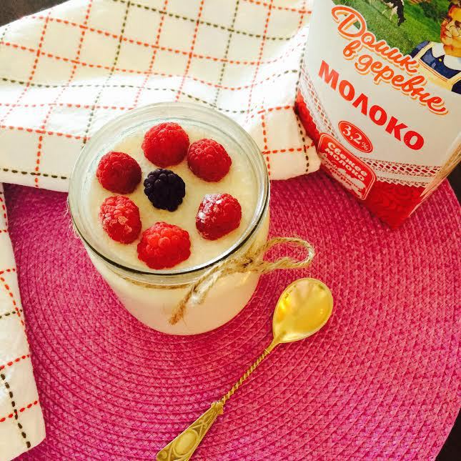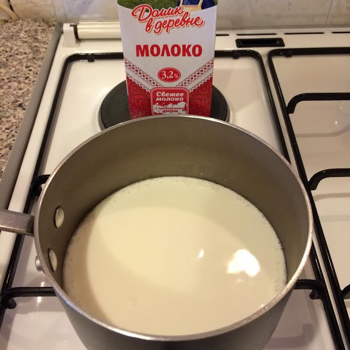 Молоко «Домик в деревне» вскипятить и охладить до 50°С.
