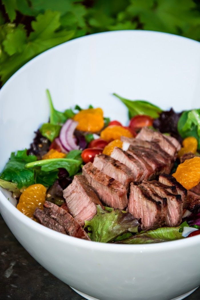 Смешаем заправку с салатом, приготовленным заранее, а сверху красиво выложим тёплое мясо.