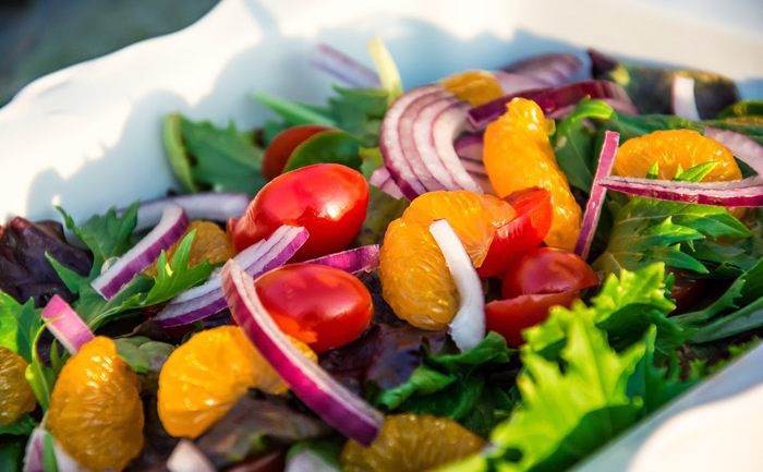 Полукольцами нарежем красный лук, помидорки - на половинки. Зелёный лук, укроп и петрушку мелко накрошим. Смешаем это с набором зелени и мандаринами. Не забудьте из консервированных мандаринов слить жидкость. Но не выливайте всю, оставьте 2-3 столовых ложки для заправки.
