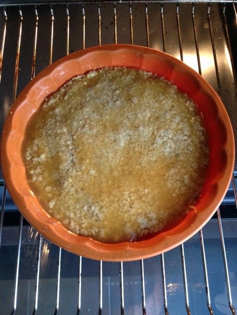 Выкладываем начинку. Затем вторую часть крошки. Утрамбовываем и ставим в разогретую до 180 градусов духовку на 30 минут.