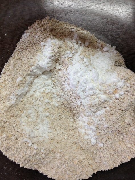 Измельчим овсяные хлопья, добавим к ним сахарную пудру, разрыхлитель и ванилин.
